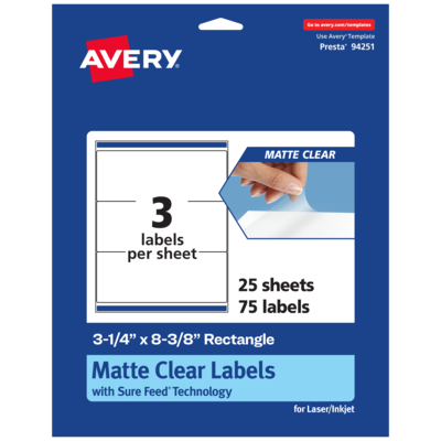 Avery Laser/Inkjet Rectangle Multipurpose Labels, 3-1/4" x 8-3/8", Clear, 75/Pack (94251)