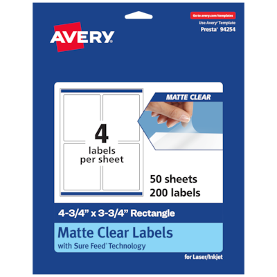 Avery Laser/Inkjet Rectangle Multipurpose Labels, 4-3/4" x 3-3/4", Clear, 200/Box (94254)