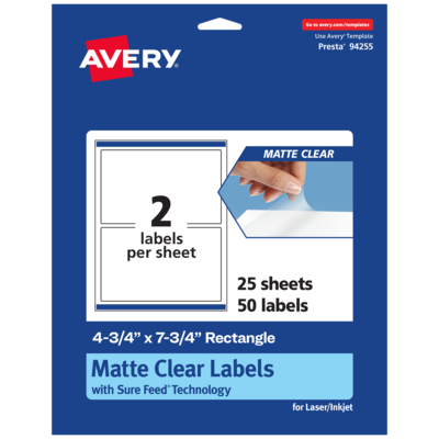 Avery Laser/Inkjet Rectangle Multipurpose Labels, 4-3/4" x 7-3/4", Clear, 50/Pack (94255)