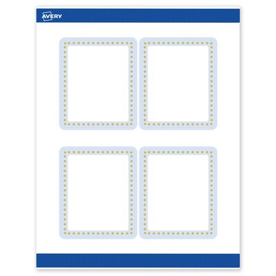 Pre-printed with beautiful designs, Avery Rectangle 4" x 3-1/3" Matte White Labels with the Gold Dots with Blue Border design help save ink and also elevate your branding and events. Pre-designed and printed with shiny matte gold ink with high-quality printers, these patterns will definitely stand out and are not easily achieved with desktop printers. Mix and match these labels with other Avery cards, tags, and name badges from the same collection that have the same pre-printed design to create a cohesive look. Featuring the helpful Pop-Up Edge technology to help lift and peel labels quickly, these permanent-adhesive labels are great for food labels for containers, logo labels, product labels, and more. The versatile matte white material is a great solution for any project. Compatible with both laser and inkjet printers, these labels make it a breeze to personalize them with your own information with a desktop printer while still looking professional. Avery premium labels are carefully constructed with beneficial features to provide the best results and allow your brand to stand out. Sure Feed technology reduces printer jams by creating a more reliable feed through your printer. Easily customize gold wedding labels, luxury holiday event labels, premium event labels, festive gold labels, and more with your own logos, text, and designs by searching for the Presta ID S00-DMC and using the templates and tools in Avery Design & Print on the Avery site. Whether you’re a business owner that wants to add more flair to products, an event planner looking to elevate an event, or a teacher looking to step up class projects, Avery labels make it easy to translate your designs into reality.