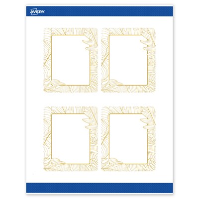 Add an elevated, professional touch to your branding or event with Avery(R) Rectangle 4" x 3-1/3" Matte White Labels featuring the Gold Monstera Leaves design. These premium labels are pre-printed with elegant, metallic gold accents that standard desktop printers simply can't replicate, giving your business or event an instant upgrade. With a design already pre-printed, you can easily customize the blank space while using less ink—just personalize and print. For a cohesive look, pair these labels with other Avery(R) products in the same design collection. Featuring convenient Pop-Up Edge technology for faster peeling, these permanent customizable labels apply smoothly and stay securely in place. The smooth matte white finish delivers clean, versatile results that work beautifully across a wide range of projects. Compatible with laser and inkjet printers, these labels make it easy to print personalized labels with professional results. Built-in Sure Feed(R) technology is designed to provide a more reliable feed through your printer, helping to reduce misalignments, printer jams, and wasted product. Search Avery Presta(R) Template S00-EVW, and use Avery(R) Design & Print to add your own logo, text, and artwork. Our easy-to-use design software lets you add your own personal touch while enjoying the consistency of the stunning, pre-printed design.