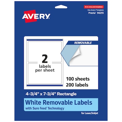 Add an elegant touch to home organization labels, price labels, labels for storage bins, product labels, labels for food containers, large bottle labels and more with Avery 4.75" x 7.75" Matte White Removable Rectangle Labels. Made with matte white paper and removable adhesive, the removable Avery labels stick and stay but remove cleanly. Apply these removable white labels to smooth surfaces such as paper, plastic, cardboard, glass, or metal and peel them away without leaving behind messy residue. Avery rectangle labels are carefully constructed with patented features to provide the best results. Sure Feed technology reduces jams or smudges by creating a more reliable feed through your printer. The print-to-the-edge layout lets you print beautiful full-bleed designs that fill each blank sticker to the edge. The Pop-Up Edge lets you fold the sheet back to pop up the edges of each label for faster peeling. The dual-compatible printable labels are compatible with both laser printers and inkjet printers. Easily customize labels with your own designs, art, symbols, and messaging in Avery Design & Print.