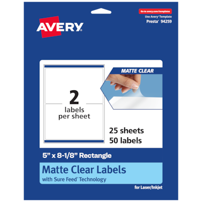 Create frosted clear product labels, shipping labels, large bottle labels, branding labels, and more with Avery 5" x 8-1/8" Matte Clear Rectangle Labels. The soft, translucent material of Avery Clear Labels is perfect for creating clear labels that blend seamlessly into lighter-colored objects and surfaces. The slightly frosted appearance also helps provide contrast to make sure your print stays legible. Avery rectangle labels are carefully constructed with patented features to provide the best results. Sure Feed technology reduces jams and smudges by creating a more reliable feed through your printer. The strong permanent label adhesive makes sure that your labels stick and stay to a variety of surfaces without peeling, curling or falling off. Easily customize labels with your own designs, art, symbols, and messaging by using the label templates and designs on the Avery website.