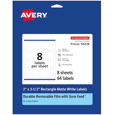 Create your own personalized ID labels for plastic and glass storage containers, pencil cup holders, food containers and more with this pack of 64 Avery 2" x 3.5" Durable Removable Rectangle Labels. Designed with a variety of unique features, Avery labels are carefully constructed to provide the best results. Sure Feed(R) technology prevents jams or smudges by creating a more reliable feed through your printer. The print-to-the-edge layout lets you print beautiful full-bleed designs that fill each blank sticker to the edge. These white rectangle labels are compatible with both laser and inkjet printers so you can effortlessly print bold, bright colors and clear, sharp text. The removable adhesive allows these labels to stick to pencil mugs, water bottles, the exteriors of laptops and other office supplies without damaging the surfaces or leaving behind residue. The durable material is also built to withstand general wear and tear while also being resistant to water damage and fading from UV rays. Easily customize office labels, product labels, storage bin labels, container labels and more with your own designs, art, symbols and messaging by using the free label templates and designs on the Avery site. Please Note: Please try to test the label adhesive on potential surfaces before using.