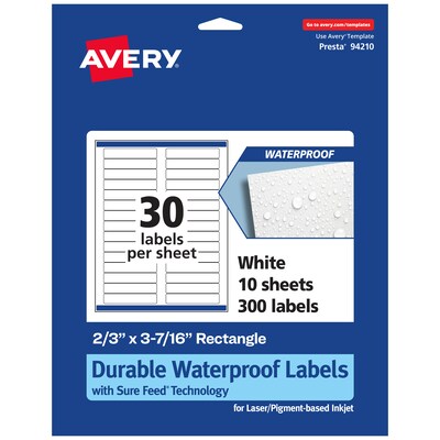 Avery Laser/Inkjet Rectangle Waterproof Multipurpose Labels, 3.4375" x 0.6667", White, 300/Pack (94210)