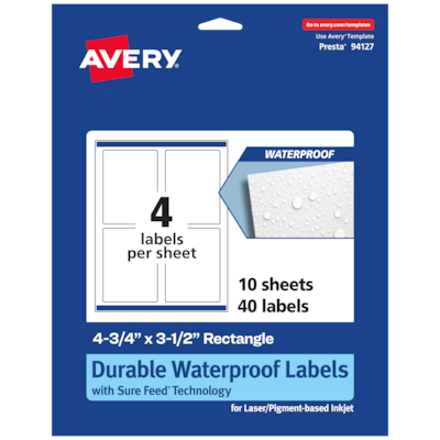 Avery Laser/Inkjet Rectangle Waterproof Multipurpose Labels, 3.5" x 4.75", White, 40/Pack (94127)