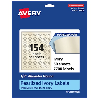 Add an elegant touch to wedding labels, mailing seals, candle labels, pricing labels, soap labels, product labels, round spice labels, mason jar labels and more with Avery .5" diameter Pearlized Ivory Round Labels. The finish of the pearlized ivory material reflects light with a radiant glow that elevates any project. Avery round labels are carefully constructed with patented features to provide the best results. Sure Feed technology reduces jams or smudges by creating a more reliable feed through your printer. The print-to-the-edge layout lets you print beautiful full-bleed designs that fill each blank sticker to the edge. The Pop-Up Edge lets you fold the sheet back to pop up the edges of each label for faster peeling. The strong permanent label adhesive makes sure that your labels stick and stay to a variety of surfaces without peeling, curling or falling off. The dual-compatible printable labels work with both laser printers and inkjet printers. Easily customize labels with your own designs, art, symbols and messaging by using the label templates and designs in Avery Design & Print. Whether you're looking for elegant wedding labels or premium product labels that will grab people's attention, Avery Pearlized Ivory Labels are the perfect choice for any project or event.