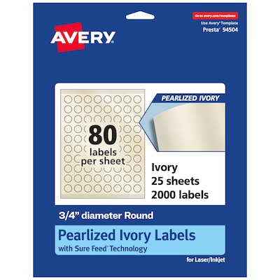 Add an elegant touch to wedding labels, mailing seals, candle labels, pricing labels, soap labels, product labels, round spice labels, mason jar labels and more with Avery .75" diameter Pearlized Ivory Round Labels. The finish of the pearlized ivory material reflects light with a radiant glow that elevates any project. Avery round labels are carefully constructed with patented features to provide the best results. Sure Feed technology reduces jams or smudges by creating a more reliable feed through your printer. The print-to-the-edge layout lets you print beautiful full-bleed designs that fill each blank sticker to the edge. The Pop-Up Edge lets you fold the sheet back to pop up the edges of each label for faster peeling. The strong permanent label adhesive makes sure that your labels stick and stay to a variety of surfaces without peeling, curling or falling off. The dual-compatible printable labels work with both laser printers and inkjet printers. Easily customize labels with your own designs, art, symbols and messaging by using the label templates and designs in Avery Design & Print. Whether you're looking for elegant wedding labels or premium product labels that will grab people's attention, Avery Pearlized Ivory Labels are the perfect choice for any project or event.