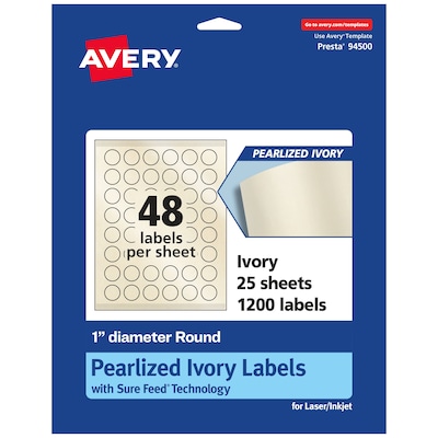 Add an elegant touch to wedding labels, mailing seals, candle labels, pricing labels, soap labels, product labels, round spice labels, mason jar labels and more with Avery 1" diameter Pearlized Ivory Round Labels. The finish of the pearlized ivory material reflects light with a radiant glow that elevates any project. Avery round labels are carefully constructed with patented features to provide the best results. Sure Feed technology reduces jams or smudges by creating a more reliable feed through your printer. The print-to-the-edge layout lets you print beautiful full-bleed designs that fill each blank sticker to the edge. The Pop-Up Edge lets you fold the sheet back to pop up the edges of each label for faster peeling. The strong permanent label adhesive makes sure that your labels stick and stay to a variety of surfaces without peeling, curling or falling off. The dual-compatible printable labels work with both laser printers and inkjet printers. Easily customize labels with your own designs, art, symbols and messaging by using the label templates and designs in Avery Design & Print. Whether you're looking for elegant wedding labels or premium product labels that will grab people's attention, Avery Pearlized Ivory Labels are the perfect choice for any project or event.