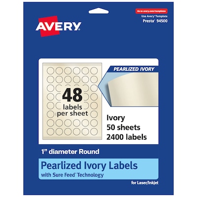 Add an elegant touch to wedding labels, mailing seals, candle labels, pricing labels, soap labels, product labels, round spice labels, mason jar labels and more with Avery 1" diameter Pearlized Ivory Round Labels. The finish of the pearlized ivory material reflects light with a radiant glow that elevates any project. Avery round labels are carefully constructed with patented features to provide the best results. Sure Feed technology reduces jams or smudges by creating a more reliable feed through your printer. The print-to-the-edge layout lets you print beautiful full-bleed designs that fill each blank sticker to the edge. The Pop-Up Edge lets you fold the sheet back to pop up the edges of each label for faster peeling. The strong permanent label adhesive makes sure that your labels stick and stay to a variety of surfaces without peeling, curling or falling off. The dual-compatible printable labels work with both laser printers and inkjet printers. Easily customize labels with your own designs, art, symbols and messaging by using the label templates and designs in Avery Design & Print. Whether you're looking for elegant wedding labels or premium product labels that will grab people's attention, Avery Pearlized Ivory Labels are the perfect choice for any project or event.