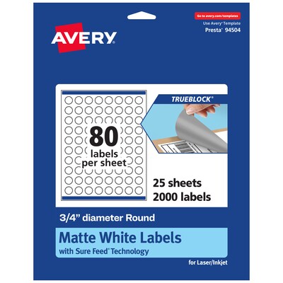 Avery Laser/Inkjet Round Multipurpose Labels, White, 80 Labels/Sheet, 25 Sheets/Pack (94504)