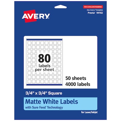 Order Avery Laser/Inkjet Square Multipurpose Labels, 0.75" x 0.75", White, 4000 Labels/Box (94102) today at Quill.com and get fast shipping. Stack coupons to get free gifts & extra discounts!