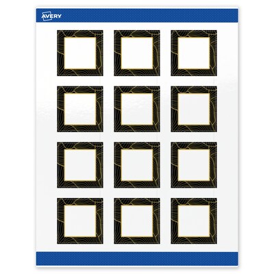 Add an elevated, professional touch to your branding or event with Avery(R) Square 2" x 2" Glossy White Labels featuring the Black Border with Gold Veins design. These premium labels are pre-printed with elegant, metallic gold accents that standard desktop printers simply can't replicate, giving your business or event an instant upgrade. With a design already pre-printed, you can easily customize the blank space while using less ink—just personalize and print. For a cohesive look, pair these labels with other Avery(R) products in the same design collection. Featuring convenient Pop-Up Edge technology for faster peeling, these permanent customizable labels apply smoothly and stay securely in place. The glossy white finish reflects light for vivid color and detail, creating a premium, polished appearance. Compatible with laser and inkjet printers, these labels make it easy to print personalized labels with professional results. Built-in Sure Feed(R) technology is designed to provide a more reliable feed through your printer, helping to reduce misalignments, printer jams, and wasted product. Search Avery Presta(R) Template S00-ETE, and use Avery(R) Design & Print to add your own logo, text, and artwork. Our easy-to-use design software lets you add your own personal touch while enjoying the consistency of the stunning, pre-printed design.