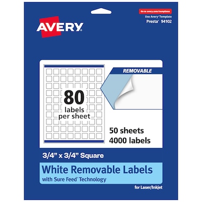 Add an elegant touch to home organization labels, price labels, pricing labels, product labels, reward stickers, planner stickers and more with Avery 3/4" x 3/4" Matte White Removable Square Labels. Made with matte white paper and removable adhesive, the removable Avery labels stick and stay but remove cleanly. Apply these removable white labels to smooth surfaces such as paper, plastic, cardboard, glass, or metal and peel them away without leaving behind messy residue. Avery square labels are carefully constructed with patented features to provide the best results. Sure Feed technology reduces jams or smudges by creating a more reliable feed through your printer. The print-to-the-edge layout lets you print beautiful full-bleed designs that fill each blank sticker to the edge. The Pop-Up Edge lets you fold the sheet back to pop up the edges of each label for faster peeling. The dual-compatible printable labels are compatible with both laser printers and inkjet printers. Easily customize labels with your own designs, art, symbols, and messaging in Avery Design & Print.