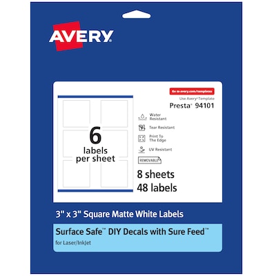 Create your own personalized labels for bath & beauty labels, candle labels, thank you tags, party favor labels and more with Avery 3" x 3" Durable Removable Square Labels. Designed with a variety of unique features, Avery labels are carefully constructed to provide the best results. Sure Feed(R) technology prevents jams or smudges by creating a more reliable feed through your printer. The print-to-the-edge layout lets you print beautiful full-bleed designs that fill each blank sticker to the edge. These white square labels are compatible with both laser and inkjet printers so you can effortlessly print bold, bright colors and clear, sharp text. The removable Surface Safe adhesive lets these labels stick to water bottles, mugs, cell phone cases, glass containers, the exteriors of laptops and more without damaging the surfaces or leaving behind residue. When you're ready to remove or replace the labels, the Surface Safe adhesive let you cleanly peel the labels away. The durable material is also built to withstand general wear and tear while also being resistant to water damage and fading from UV rays. Easily customize your own product labels, holiday labels, mason jar labels and more with your own designs, art, symbols and messaging by using the free label templates and designs on the Avery site. Please Note: These labels are not recommended for use on painted drywall. Please try to test the label adhesive on potential surfaces before using.)