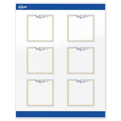 Pre-printed with beautiful designs, Avery Square 3" x 3" Glossy White Labels with the Gold & Navy Border with Florals design help save ink and also elevate your branding and events. Pre-designed and printed with shiny matte gold ink with high-quality printers, these patterns will definitely stand out and are not easily achieved with desktop printers. Mix and match these labels with other Avery cards, tags, and name badges from the same collection that have the same pre-printed design to create a cohesive look. Featuring the helpful Pop-Up Edge technology to help lift and peel labels quickly, these permanent-adhesive labels are great for food labels for containers, logo labels, candle labels, and more. Made with a glossy white material, the reflective finish adds a professional, photo-quality look to any project. Compatible with both laser and inkjet printers, these labels make it a breeze to personalize them with your own information with a desktop printer while still looking professional. Avery premium labels are carefully constructed with beneficial features to provide the best results and allow your brand to stand out. Sure Feed technology reduces printer jams by creating a more reliable feed through your printer. Easily customize gold wedding labels, luxury holiday event labels, premium event labels, festive gold labels, and more with your own logos, text, and designs by searching for the Presta ID S00-DNJ and using the templates and tools in Avery Design & Print on the Avery site. Whether you’re a business owner that wants to add more flair to products, an event planner looking to elevate an event, or a teacher looking to step up class projects, Avery labels make it easy to translate your designs into reality.