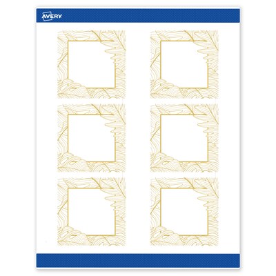 Add an elevated, professional touch to your branding or event with Avery(R) Square 3" x 3" Matte White Labels featuring the Gold Monstera Leaves design. These premium labels are pre-printed with elegant, metallic gold accents that standard desktop printers simply can't replicate, giving your business or event an instant upgrade. With a design already pre-printed, you can easily customize the blank space while using less ink—just personalize and print. For a cohesive look, pair these labels with other Avery(R) products in the same design collection. Featuring convenient Pop-Up Edge technology for faster peeling, these permanent customizable labels apply smoothly and stay securely in place. The smooth matte white finish delivers clean, versatile results that work beautifully across a wide range of projects. Compatible with laser and inkjet printers, these labels make it easy to print personalized labels with professional results. Built-in Sure Feed(R) technology is designed to provide a more reliable feed through your printer, helping to reduce misalignments, printer jams, and wasted product. Search Avery Presta(R) Template S00-EW7, and use Avery(R) Design & Print to add your own logo, text, and artwork. Our easy-to-use design software lets you add your own personal touch while enjoying the consistency of the stunning, pre-printed design.