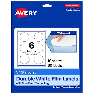 Create professional, long-lasting canning labels, food labels, thank you labels, and more with Avery Durable White Film 3" Starburst Labels. Designed to withstand harsh conditions, these durable white labels can be completely submerged in water without falling apart. They are also resistant to damage from heat, cold, oil and tearing, plus they are safe to wipe with household cleaners. Packed with thoughtful details, Avery starburst labels deliver professional results and reliable performance. For a strong, lasting hold, permanent adhesive keeps your custom label stickers in place without lifting or peeling. Built-in Sure Feed technology helps reduce misalignments and printer jams by creating a more reliable feed through your printer. The print-to-the-edge layout lets you create bold, full-bleed designs that fill each printable label. Use Avery Design & Print, our easy-to-use design software, and our professionally designed label templates to customize your labels your way. You can also use your own designs, art, and messaging for a truly personal touch, then print your labels on demand. Optimized for laser and pigment-based inkjet printers, each 8.5" x 11" sheet produces crisp text and vivid colors that last. *Please Note: Avery durable white film labels are not compatible with traditional dye-based inkjet printers. Ink from dye-based inkjet printers will smear when exposed to water. Please check your printer's manual to confirm if you are using pigment-based ink.