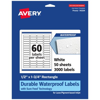 Avery Laser/Inkjet Waterproof Multipurpose Rectangle Labels, 0.5 x 1.75, White, 3000 Labels/Box (94204)