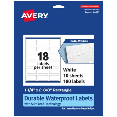 Order Avery Laser/Inkjet Waterproof Multipurpose Rectangle Labels, 1.25" x 2.375", White, 180 Labels/Pack (94227) today at Quill.com and get fast shipping. Stack coupons to get free gifts & extra discounts!
