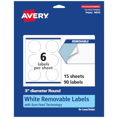 Add an elegant touch to home organization labels, price labels, mailing seals, candle labels, pricing labels, soap labels, product labels, round spice labels, mason jar labels and more with Avery 3" diameter Matte White Removable Round Labels. Made with matte white paper and removable adhesive, the removable Avery labels stick and stay but remove cleanly. Apply these removable white labels to smooth surfaces such as paper, plastic, cardboard, glass, or metal and peel them away without leaving behind messy residue. Avery round labels are carefully constructed with patented features to provide the best results. Sure Feed technology reduces jams or smudges by creating a more reliable feed through your printer. The print-to-the-edge layout lets you print beautiful full-bleed designs that fill each blank sticker to the edge. The Pop-Up Edge lets you fold the sheet back to pop up the edges of each label for faster peeling. The dual-compatible printable labels are compatible with both laser printers and inkjet printers. Easily customize labels with your own designs, art, symbols, and messaging in Avery Design & Print.