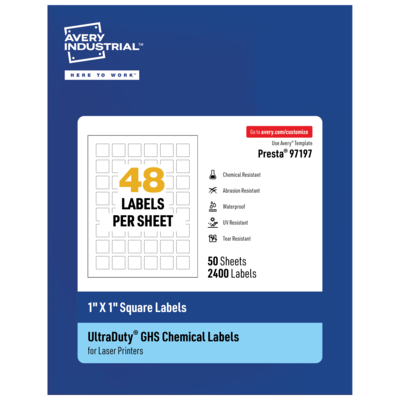 This package includes 50 regular paper-sized label sheets with 48 labels each for a total of 2400 square labels. Individual labels measure 1" X 1" and work well for chemical safety labels and inventory labels for vials, tubes as well as small containers, for example, ID and barcode labels for jars and bottles. Strong enough for safety compliance, you can reliably use our printable chemical-resistant waterproof labels for tons of everyday uses, for example, ID labels for bottles, sanitizer labels, labels for food containers, essential oil labels and outdoor waterproof garden labels for plants. These printable labels are made with polyester, not paper. They stick permanently on a variety of surfaces including metal, plastic, painted surfaces, fiber, polycarbonate and glass. Avery UltraDuty GHS chemical labels are designed for creating chemical safety labels that comply with OSHA standards and international standards for shipping chemicals overseas. Our waterproof blank labels have been tested to last up to 90 days in the ocean without falling off, peeling, dissolving or fading (BS5609 Sec. 2). Create waterproof labels that won't smear or smudge (even when submerged in water) with standard laser printers including: OKI C711 series and OKI C900 series printers. Ideal for a wide range of uses including: ID labeling in wet facilities, laboratories and manufacturing plants; color coding freezer labels; water bottle labels for kids and hand sanitizer labels and stickers that don't fall off or smudge from sanitizer drips. Perfect for adding QR codes on items that may get wet such as beer bottle labels, wine bottle labels, barcode labels and more. Print-to-the-Edge feature means that your designs and background color print all the way to the edge of the label. With no extra white border or outline, you have more printing space to feature your label designs.