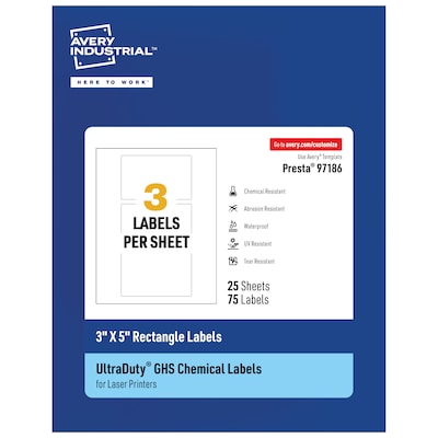Avery Laser UltraDuty GHS Labels 3" x 5", White, 3 Labels/Sheet, 25 Sheets/Pack (97186)