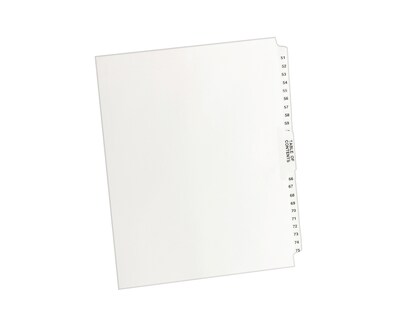 Guilty of disorderly files? It's time to crack down on chaos. This Premium Collated Legal Divider Set features side tabs 51-75 and a Table of Contents tab, so you can organize index briefs, legal exhibits, mortgage documentation files and more. The 8-1/2" x 11" white paper stock features Rip Proof(TM) reinforced tabs that are preprinted on both sides using Helvetica bold type, so you can easily access the documents you need. Indexes can fit any binding system because the binding edge is unpunched. It's easy to bring order to your own files. Go ahead, throw the book at disorganization.