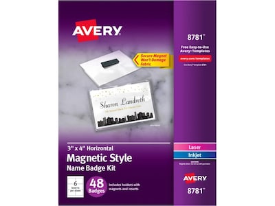 Quickly and easily create durable, professional magnetic name tags from the convenience of your home or workplace with the Avery magnetic name badge. This name badge with magnets is perfect for professional and social gatherings including parties, trade shows, conferences, mixers, and business meetings. The badge holder features strong magnets that hold it in place without damaging materials or flipping over. The tag holder is made of durable PVC heavyweight plastic and features a pocket-style design, so inserts are quick and easy to load. The printable 8.5" x 11" sheets are compatible with both laser and inkjet printers. Great for custom name badges, photo ID cards, staff ID badges, personalized name tags, kids ID cards, and more. This name badge kit comes with everything needed to make 48 name badges, including 3" x 4" printable name badges inserts and horizontal badge holders with magnets.