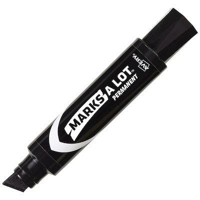 Perfect for those situations when you need to be bold, big and brilliant, this jumbo marker is the largest Avery Marks A Lot marker available. The durable chisel tip is 5/8" wide and can be angled to write lines in multiple widths without fraying over time. This remarkable black permanent marker ink sets in quickly when written but won't become dried out if you forget the cap. Leave the cap off the marker for up to 30 minutes and you'll still be able to pick it back up and keep writing. The versatile permanent ink resists wear, fading and water exposure and works in almost any situation. These markers work on numerous surfaces including paper, cardboard, metal, PVC pipes, concrete walls, plastic and ceramic. Great for marking sports equipment, creating yard sale signs, celebration signs, posters and marking boxes in warehouses. Marks A Lot permanent markers cover every use for classrooms, offices, manufacturing facilities and more. Avery Marks A Lot markers are non-toxic and low-odor. Our ink is ACMI certified as non-toxic and conforms to ASTM D4236.