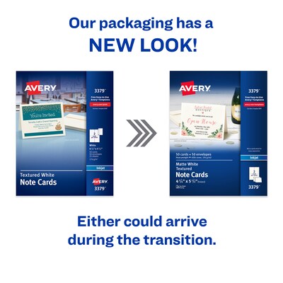 Avery 03379 Note Cards makes it so easy to create personalized greeting cards, party invitations, business marketing collateral and more. Crafted from 65 lbs. / 176 gsm heavyweight cardstock for an elegant and upscale look, each textured white sheet comes micro-perforated and scored for smooth-edged 4.25" x 5.5" note cards that are easy to separate and fold. For added value, this pack of 50 cards also includes 50 envelopes. Whether you have your own design or you're starting from scratch, Avery Design & Print Online makes it easy to create and print customized cards from your own home or business. The browser-based software has everything you need to design DIY greeting cards, birthday cards, wedding invitation cards, special event invites for your office or small business and more. Try it out today on the Avery website and print on your inkjet printer.