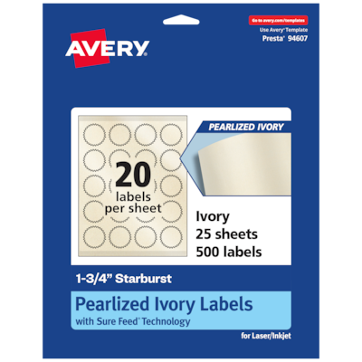 Add an elegant touch to wedding labels, reward stickers for kids, certificate seals, decorative labels, mailing seals, planner stickers and more with Avery 1.75" Pearlized Ivory Starburst Labels. The finish of the pearlized ivory material reflects light with a radiant glow that elevates any project. Avery starburst labels are carefully constructed with patented features to provide the best results. Sure Feed technology reduces jams or smudges by creating a more reliable feed through your printer. The print-to-the-edge layout lets you print beautiful full-bleed designs that fill each blank sticker to the edge. The strong permanent label adhesive makes sure that your labels stick and stay to a variety of surfaces without peeling, curling or falling off. The dual-compatible printable labels work with both laser printers and inkjet printers. Easily customize labels with your own designs, art, symbols and messaging by using the label templates and designs in Avery Design & Print. Whether you’re looking for elegant wedding labels or premium product labels that will grab people’s attention, Avery Pearlized Ivory Labels are the perfect choice for any project or event.