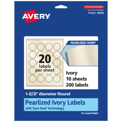 Add an elegant touch to wedding labels, mailing seals, candle labels, pricing labels, soap labels, product labels, round spice labels, mason jar labels and more with Avery 1-2/3" diameter Pearlized Ivory Round Labels. The finish of the pearlized ivory material reflects light with a radiant glow that elevates any project. Avery round labels are carefully constructed with patented features to provide the best results. Sure Feed technology reduces jams or smudges by creating a more reliable feed through your printer. The print-to-the-edge layout lets you print beautiful full-bleed designs that fill each blank sticker to the edge. The Pop-Up Edge(R) lets you fold the sheet back to pop up the edges of each label for faster peeling. The strong permanent label adhesive makes sure that your labels stick and stay to a variety of surfaces without peeling, curling or falling off. The dual-compatible printable labels work with both laser printers and inkjet printers. Easily customize labels with your own designs, art, symbols and messaging by using the label templates and designs in Avery Design & Print. Whether you’re looking for elegant wedding labels or premium product labels that will grab people’s attention, Avery Pearlized Ivory Labels are the perfect choice for any project or event.