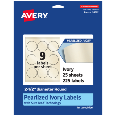 Add an elegant touch to wedding labels, mailing seals, candle labels, pricing labels, soap labels, product labels, round spice labels, mason jar labels and more with Avery 2.5" diameter Pearlized Ivory Round Labels. The finish of the pearlized ivory material reflects light with a radiant glow that elevates any project. Avery round labels are carefully constructed with patented features to provide the best results. Sure Feed technology reduces jams or smudges by creating a more reliable feed through your printer. The print-to-the-edge layout lets you print beautiful full-bleed designs that fill each blank sticker to the edge. The strong permanent label adhesive makes sure that your labels stick and stay to a variety of surfaces without peeling, curling or falling off. The dual-compatible printable labels work with both laser printers and inkjet printers. Easily customize labels with your own designs, art, symbols and messaging by using the label templates and designs in Avery Design & Print. Whether you’re looking for elegant wedding labels or premium product labels that will grab people’s attention, Avery Pearlized Ivory Labels are the perfect choice for any project or event.