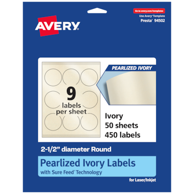 Elevate your product or project with Avery(R) Pearlized Ivory Paper Labels that add elegance with a subtle shimmer. Add an elegant touch to wedding labels, mailing seals, candle labels, pricing labels, soap labels, product labels, round spice labels, mason jar labels and more with Avery 2.5" diameter Pearlized Ivory Round Labels. The finish of the pearlized ivory material reflects light with a radiant glow that elevates any project. Avery round labels are carefully constructed with patented features to provide the best results. Sure Feed technology reduces jams or smudges by creating a more reliable feed through your printer. The print-to-the-edge layout lets you print beautiful full-bleed designs that fill each blank sticker to the edge. The strong permanent label adhesive makes sure that your labels stick and stay to a variety of surfaces without peeling, curling or falling off. The dual-compatible printable labels work with both laser printers and inkjet printers. Easily customize labels with your own designs, art, symbols and messaging by using the label templates and designs in Avery Design & Print. Whether you’re looking for elegant wedding labels or premium product labels that will grab people’s attention, Avery Pearlized Ivory Labels are the perfect choice for any project or event.
