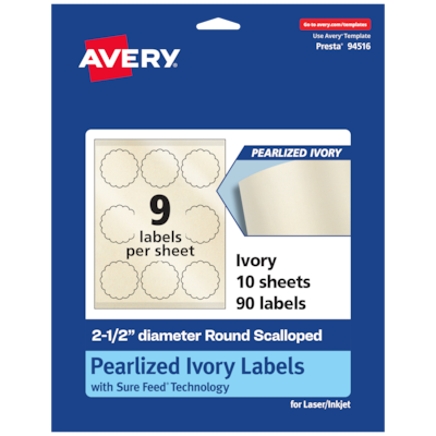 Add an elegant touch to wedding labels, mailing seals, candle labels, pricing labels, soap labels, product labels, round spice labels, mason jar labels and more with Avery 2.5" diameter Pearlized Ivory Round Scalloped Labels. The finish of the pearlized ivory material reflects light with a radiant glow that elevates any project. Avery round scalloped labels are carefully constructed with patented features to provide the best results. Sure Feed technology reduces jams or smudges by creating a more reliable feed through your printer. The print-to-the-edge layout lets you print beautiful full-bleed designs that fill each blank sticker to the edge. The strong permanent label adhesive makes sure that your labels stick and stay to a variety of surfaces without peeling, curling or falling off. The dual-compatible printable labels work with both laser printers and inkjet printers. Easily customize labels with your own designs, art, symbols and messaging by using the label templates and designs in Avery Design & Print. Whether you’re looking for elegant wedding labels or premium product labels that will grab people’s attention, Avery Pearlized Ivory Labels are the perfect choice for any project or event.