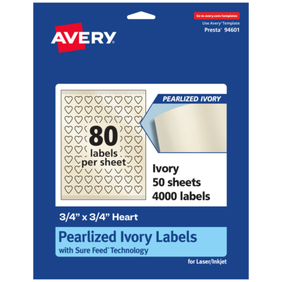 Add an elegant touch to wedding labels, reward stickers, decorative labels, mailing seals, product labels, planner stickers and more with Avery .75" x .75" Pearlized Ivory Heart Labels. The finish of the pearlized ivory material reflects light with a radiant glow that elevates any project. Avery heart labels are carefully constructed with patented features to provide the best results. Sure Feed technology reduces jams or smudges by creating a more reliable feed through your printer. The print-to-the-edge layout lets you print beautiful full-bleed designs that fill each blank sticker to the edge. The strong permanent label adhesive makes sure that your labels stick and stay to a variety of surfaces without peeling, curling or falling off. The dual-compatible printable labels work with both laser printers and inkjet printers. Easily customize labels with your own designs, art, symbols and messaging by using the label templates and designs in Avery Design & Print. Whether you’re looking for elegant wedding labels or premium product labels that will grab people’s attention, Avery Pearlized Ivory Labels are the perfect choice for any project or event.