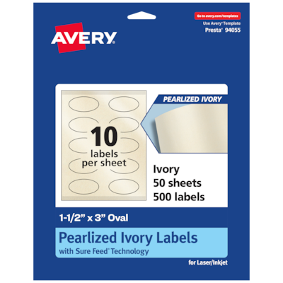 Add an elegant touch to wedding labels, labels for food containers, mason jar labels, canning labels, ingredient labels, soap jar labels and more with Avery 1.5" x 3" Pearlized Ivory Oval Labels. The finish of the pearlized ivory material reflects light with a radiant glow that elevates any project. Avery oval labels are carefully constructed with patented features to provide the best results. Sure Feed technology reduces jams or smudges by creating a more reliable feed through your printer. The print-to-the-edge layout lets you print beautiful full-bleed designs that fill each blank sticker to the edge. The Pop-Up Edge(R) lets you fold the sheet back to pop up the edges of each label for faster peeling. The strong permanent label adhesive makes sure that your labels stick and stay to a variety of surfaces without peeling, curling or falling off. The dual-compatible printable labels work with both laser printers and inkjet printers. Easily customize labels with your own designs, art, symbols and messaging by using the label templates and designs in Avery Design & Print. Whether you’re looking for elegant wedding labels or premium product labels that will grab people’s attention, Avery Pearlized Ivory Labels are the perfect choice for any project or event.