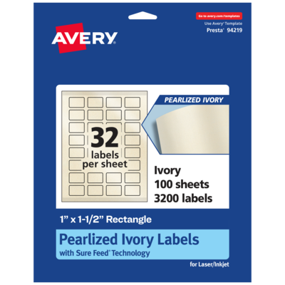 Add an elegant touch to wedding labels, mailing labels, product labels, labels for food containers, soap labels, candle jar labels, body scrub labels and more with Avery 1" x 1.5" Pearlized Ivory Rectangle Labels. The finish of the pearlized ivory material reflects light with a radiant glow that elevates any project. Avery rectangle labels are carefully constructed with patented features to provide the best results. Sure Feed technology reduces jams or smudges by creating a more reliable feed through your printer. The print-to-the-edge layout lets you print beautiful full-bleed designs that fill each blank sticker to the edge. The Pop-Up Edge(R) lets you fold the sheet back to pop up the edges of each label for faster peeling. The strong permanent label adhesive makes sure that your labels stick and stay to a variety of surfaces without peeling, curling or falling off. The dual-compatible printable labels work with both laser printers and inkjet printers. Easily customize labels with your own designs, art, symbols and messaging by using the label templates and designs in Avery Design & Print. Whether you’re looking for elegant wedding labels or premium product labels that will grab people’s attention, Avery Pearlized Ivory Labels are the perfect choice for any project or event.
