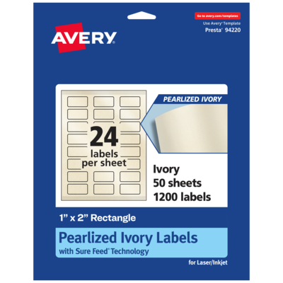 Add an elegant touch to wedding labels, mailing labels, product labels, labels for food containers, soap labels, candle jar labels, body scrub labels and more with Avery 1" x 2" Pearlized Ivory Rectangle Labels. The finish of the pearlized ivory material reflects light with a radiant glow that elevates any project. Avery rectangle labels are carefully constructed with patented features to provide the best results. Sure Feed technology reduces jams or smudges by creating a more reliable feed through your printer. The print-to-the-edge layout lets you print beautiful full-bleed designs that fill each blank sticker to the edge. The Pop-Up Edge(R) lets you fold the sheet back to pop up the edges of each label for faster peeling. The strong permanent label adhesive makes sure that your labels stick and stay to a variety of surfaces without peeling, curling or falling off. The dual-compatible printable labels work with both laser printers and inkjet printers. Easily customize labels with your own designs, art, symbols and messaging by using the label templates and designs in Avery Design & Print. Whether you’re looking for elegant wedding labels or premium product labels that will grab people’s attention, Avery Pearlized Ivory Labels are the perfect choice for any project or event.