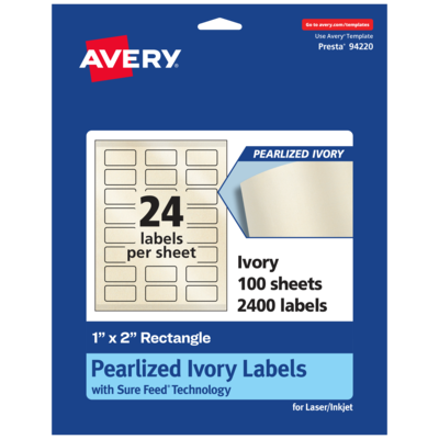 Add an elegant touch to wedding labels, mailing labels, product labels, labels for food containers, soap labels, candle jar labels, body scrub labels and more with Avery 1" x 2" Pearlized Ivory Rectangle Labels. The finish of the pearlized ivory material reflects light with a radiant glow that elevates any project. Avery rectangle labels are carefully constructed with patented features to provide the best results. Sure Feed technology reduces jams or smudges by creating a more reliable feed through your printer. The print-to-the-edge layout lets you print beautiful full-bleed designs that fill each blank sticker to the edge. The Pop-Up Edge(R) lets you fold the sheet back to pop up the edges of each label for faster peeling. The strong permanent label adhesive makes sure that your labels stick and stay to a variety of surfaces without peeling, curling or falling off. The dual-compatible printable labels work with both laser printers and inkjet printers. Easily customize labels with your own designs, art, symbols and messaging by using the label templates and designs in Avery Design & Print. Whether you’re looking for elegant wedding labels or premium product labels that will grab people’s attention, Avery Pearlized Ivory Labels are the perfect choice for any project or event.