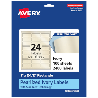 Add an elegant touch to wedding labels, mailing labels, product labels, labels for food containers, soap labels, candle jar labels, body scrub labels and more with Avery 1" x 2.5" Pearlized Ivory Rectangle Labels. The finish of the pearlized ivory material reflects light with a radiant glow that elevates any project. Avery rectangle labels are carefully constructed with patented features to provide the best results. Sure Feed technology reduces jams or smudges by creating a more reliable feed through your printer. The strong permanent label adhesive makes sure that your labels stick and stay to a variety of surfaces without peeling, curling or falling off. The dual-compatible printable labels work with both laser printers and inkjet printers. Easily customize labels with your own designs, art, symbols and messaging by using the label templates and designs in Avery Design & Print. Whether you’re looking for elegant wedding labels or premium product labels that will grab people’s attention, Avery Pearlized Ivory Labels are the perfect choice for any project or event.