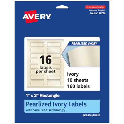 Add an elegant touch to wedding labels, mailing labels, product labels, labels for food containers, soap labels, candle jar labels, body scrub labels and more with Avery 1" x 3" Pearlized Ivory Rectangle Labels. The finish of the pearlized ivory material reflects light with a radiant glow that elevates any project. Avery rectangle labels are carefully constructed with patented features to provide the best results. Sure Feed technology reduces jams or smudges by creating a more reliable feed through your printer. The print-to-the-edge layout lets you print beautiful full-bleed designs that fill each blank sticker to the edge. The Pop-Up Edge(R) lets you fold the sheet back to pop up the edges of each label for faster peeling. The strong permanent label adhesive makes sure that your labels stick and stay to a variety of surfaces without peeling, curling or falling off. The dual-compatible printable labels work with both laser printers and inkjet printers. Easily customize labels with your own designs, art, symbols and messaging by using the label templates and designs in Avery Design & Print. Whether you’re looking for elegant wedding labels or premium product labels that will grab people’s attention, Avery Pearlized Ivory Labels are the perfect choice for any project or event.