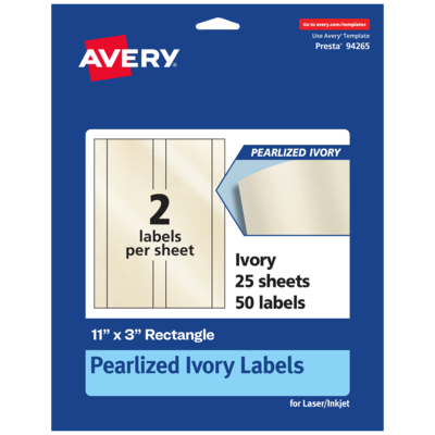 Add an elegant touch to wedding labels, mailing labels, product labels, labels for food containers, soap labels, candle jar labels, tamper-evident seals and more with Avery 11" x 3" Pearlized Ivory Rectangle Labels. The finish of the pearlized ivory material reflects light with a radiant glow that elevates any project. Avery rectangle labels are carefully constructed with patented features to provide the best results. The strong permanent label adhesive makes sure that your labels stick and stay to a variety of surfaces without peeling, curling or falling off. The dual-compatible printable labels work with both laser printers and inkjet printers. Easily customize labels with your own designs, art, symbols and messaging by using the label templates and designs in Avery Design & Print. Whether you’re looking for elegant wedding labels or premium product labels that will grab people’s attention, Avery Pearlized Ivory Labels are the perfect choice for any project or event.
