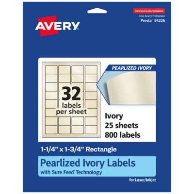 Elevate your product or project with Avery(R) Pearlized Ivory Paper Labels that add elegance with a subtle shimmer. Add an elegant touch to wedding labels, mailing labels, product labels, labels for food containers, soap labels, candle jar labels, body scrub labels and more with Avery 1.25" x 1.75" Pearlized Ivory Rectangle Labels. The finish of the pearlized ivory material reflects light with a radiant glow that elevates any project. Avery rectangle labels are carefully constructed with patented features to provide the best results. Sure Feed technology reduces jams or smudges by creating a more reliable feed through your printer. The strong permanent label adhesive makes sure that your labels stick and stay to a variety of surfaces without peeling, curling or falling off. The dual-compatible printable labels work with both laser printers and inkjet printers. Easily customize labels with your own designs, art, symbols and messaging by using the label templates and designs in Avery Design & Print. Whether you’re looking for elegant wedding labels or premium product labels that will grab people’s attention, Avery Pearlized Ivory Labels are the perfect choice for any project or event.
