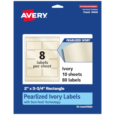 Add an elegant touch to wedding labels, mailing labels, product labels, labels for food containers, soap labels, candle jar labels, body scrub labels and more with Avery 2" x 3.75" Pearlized Ivory Rectangle Labels. The finish of the pearlized ivory material reflects light with a radiant glow that elevates any project. Avery rectangle labels are carefully constructed with patented features to provide the best results. Sure Feed technology reduces jams or smudges by creating a more reliable feed through your printer. The print-to-the-edge layout lets you print beautiful full-bleed designs that fill each blank sticker to the edge. The Pop-Up Edge(R) lets you fold the sheet back to pop up the edges of each label for faster peeling. The strong permanent label adhesive makes sure that your labels stick and stay to a variety of surfaces without peeling, curling or falling off. The dual-compatible printable labels work with both laser printers and inkjet printers. Easily customize labels with your own designs, art, symbols and messaging by using the label templates and designs in Avery Design & Print. Whether you’re looking for elegant wedding labels or premium product labels that will grab people’s attention, Avery Pearlized Ivory Labels are the perfect choice for any project or event.