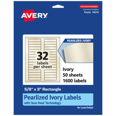 Elevate your product or project with Avery(R) Pearlized Ivory Paper Labels that add elegance with a subtle shimmer. Add an elegant touch to wedding labels, mailing labels, product labels, labels for food containers, soap labels, candle jar labels, body scrub labels and more with Avery 5/8" x 3" Pearlized Ivory Rectangle Labels. The finish of the pearlized ivory material reflects light with a radiant glow that elevates any project. Avery rectangle labels are carefully constructed with patented features to provide the best results. Sure Feed technology reduces jams or smudges by creating a more reliable feed through your printer. The strong permanent label adhesive makes sure that your labels stick and stay to a variety of surfaces without peeling, curling or falling off. The dual-compatible printable labels work with both laser printers and inkjet printers. Easily customize labels with your own designs, art, symbols and messaging by using the label templates and designs in Avery Design & Print. Whether you’re looking for elegant wedding labels or premium product labels that will grab people’s attention, Avery Pearlized Ivory Labels are the perfect choice for any project or event.