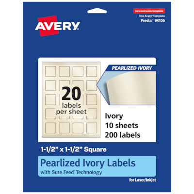 Add an elegant touch to wedding labels, candle labels, mason jar labels, pricing labels, soap labels, product labels, canning labels, ingredient labels and more with Avery 1.5" x 1.5" Pearlized Ivory Square Labels. The finish of the pearlized ivory material reflects light with a radiant glow that elevates any project. Avery square labels are carefully constructed with patented features to provide the best results. Sure Feed technology reduces jams or smudges by creating a more reliable feed through your printer. The print-to-the-edge layout lets you print beautiful full-bleed designs that fill each blank sticker to the edge. The Pop-Up Edge(R) lets you fold the sheet back to pop up the edges of each label for faster peeling. The strong permanent label adhesive makes sure that your labels stick and stay to a variety of surfaces without peeling, curling or falling off. The dual-compatible printable labels work with both laser printers and inkjet printers. Easily customize labels with your own designs, art, symbols and messaging by using the label templates and designs in Avery Design & Print. Whether you’re looking for elegant wedding labels or premium product labels that will grab people’s attention, Avery Pearlized Ivory Labels are the perfect choice for any project or event.