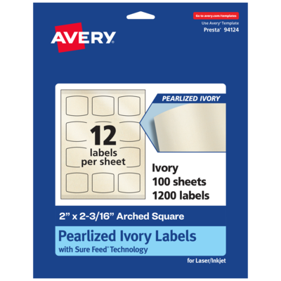 Add an elegant touch to wedding labels, cosmetic labels, lotion labels, soap labels, perfume labels, jar labels, candle labels, jewelry labels, mailing labels and more with Avery 2" x 2-3/16" Pearlized Ivory Arched Square Labels. The finish of the pearlized ivory material reflects light with a radiant glow that elevates any project. Avery arched square labels are carefully constructed with patented features to provide the best results. Sure Feed technology reduces jams or smudges by creating a more reliable feed through your printer. The print-to-the-edge layout lets you print beautiful full-bleed designs that fill each blank sticker to the edge. The strong permanent label adhesive makes sure that your labels stick and stay to a variety of surfaces without peeling, curling or falling off. The dual-compatible printable labels work with both laser printers and inkjet printers. Easily customize labels with your own designs, art, symbols and messaging by using the label templates and designs in Avery Design & Print. Whether you’re looking for elegant wedding labels or premium product labels that will grab people’s attention, Avery Pearlized Ivory Labels are the perfect choice for any project or event.