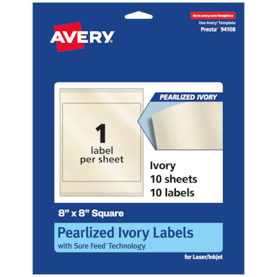Add an elegant touch to wedding labels, candle labels, mason jar labels, pricing labels, soap labels, product labels, canning labels, ingredient labels and more with Avery 8" x 8" Pearlized Ivory Square Labels. The finish of the pearlized ivory material reflects light with a radiant glow that elevates any project. Avery square labels are carefully constructed with patented features to provide the best results. Sure Feed technology reduces jams or smudges by creating a more reliable feed through your printer. The strong permanent label adhesive makes sure that your labels stick and stay to a variety of surfaces without peeling, curling or falling off. The dual-compatible printable labels work with both laser printers and inkjet printers. Easily customize labels with your own designs, art, symbols and messaging by using the label templates and designs in Avery Design & Print. Whether you’re looking for elegant wedding labels or premium product labels that will grab people’s attention, Avery Pearlized Ivory Labels are the perfect choice for any project or event.